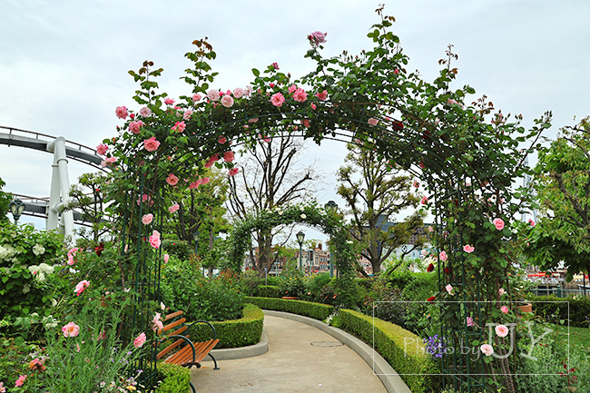USJでも、パークのバラ園、ローズオブフェイムで薔薇が咲き始めています。