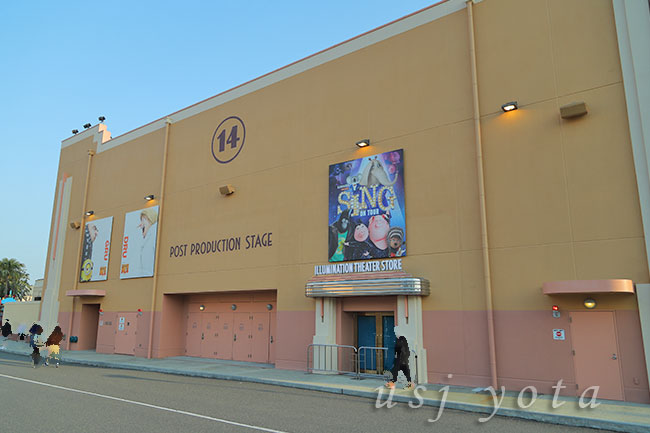 POST PRODUCTION STAGE と書かれた文字の下にある扉が出口で、その右手にSINGの看板があり、看板の下にイルミネーションシアターストアの入り口が設けられています。