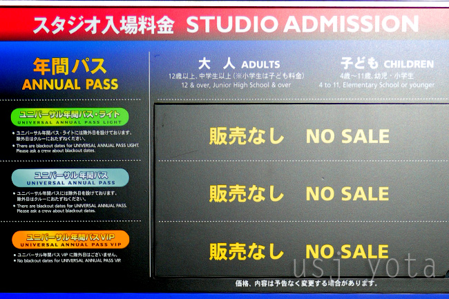 年間パスの販売休止については、USJチケットブースのチケット価格表を見ると理解できます。↓