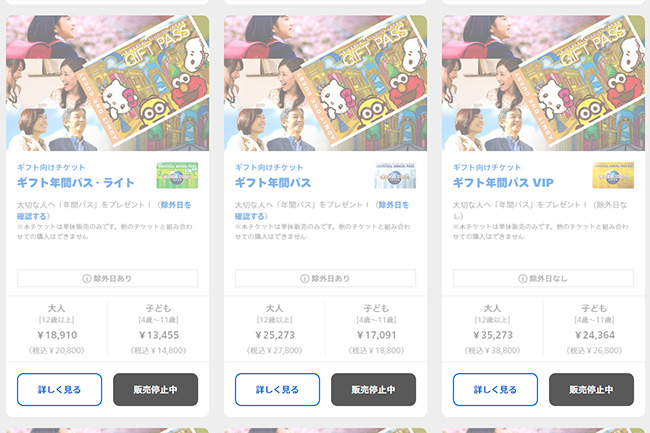 ちなみに、販売休止になっている年間パスは、以下のように、販売停止中という表記になっています↓