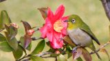 USJの椿の生垣にメジロが蜜を吸いに来る