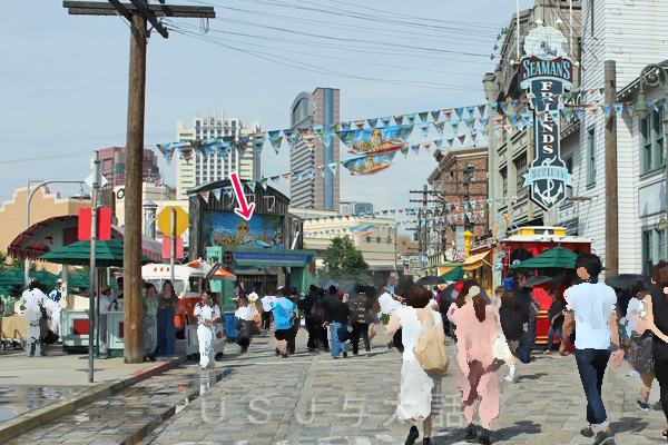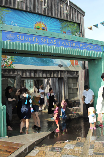 二つ目は、ニューヨークエリアのラグーンに面して、飲食やゲームのカートが並ぶ「サマー・スプラッシュ・マーケット」内にある、『サマースプラッシュウォーター&パワー』。