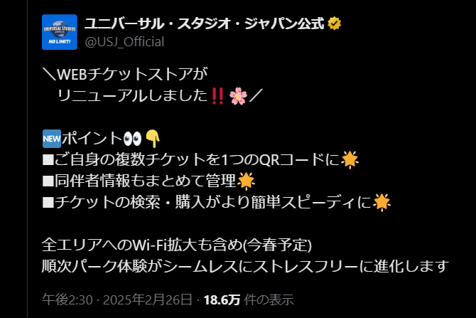 2025年2月26日ユニバーサルスタジオジャパン公式Xで、『全エリアのWi-Fi拡大(今春予定)』と書かれた投稿がありました。